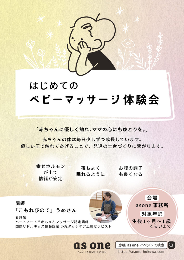 今回のイベントは、「はじめてのベビーマッサージ」体験会のご案内です。