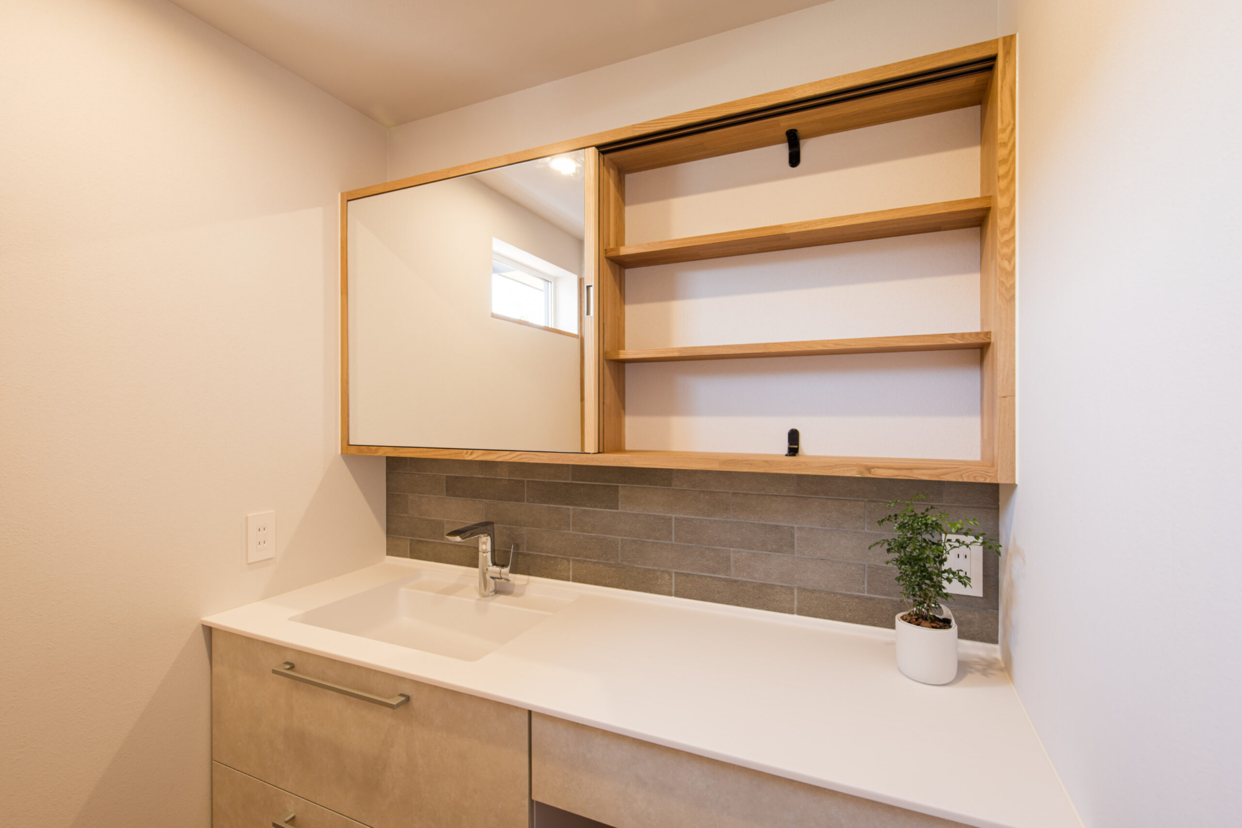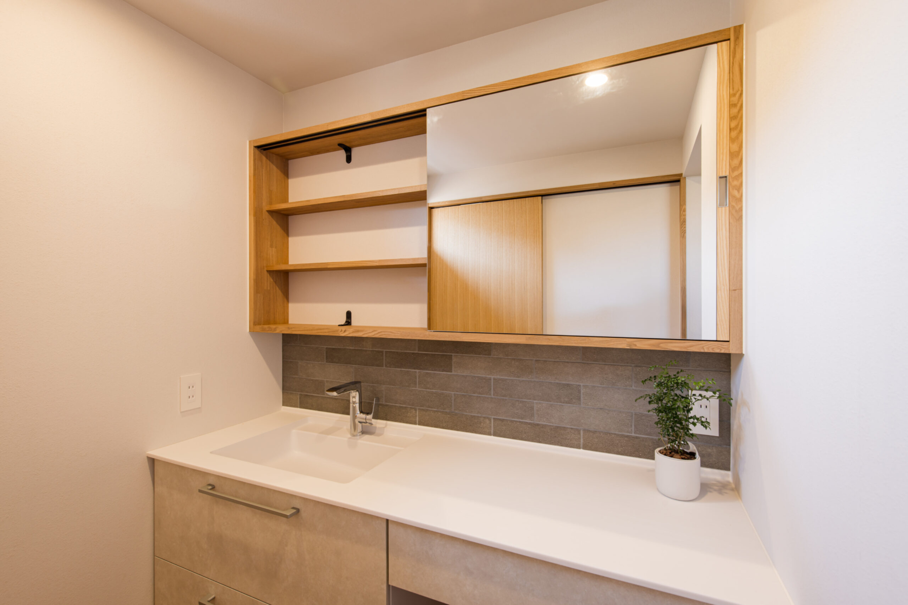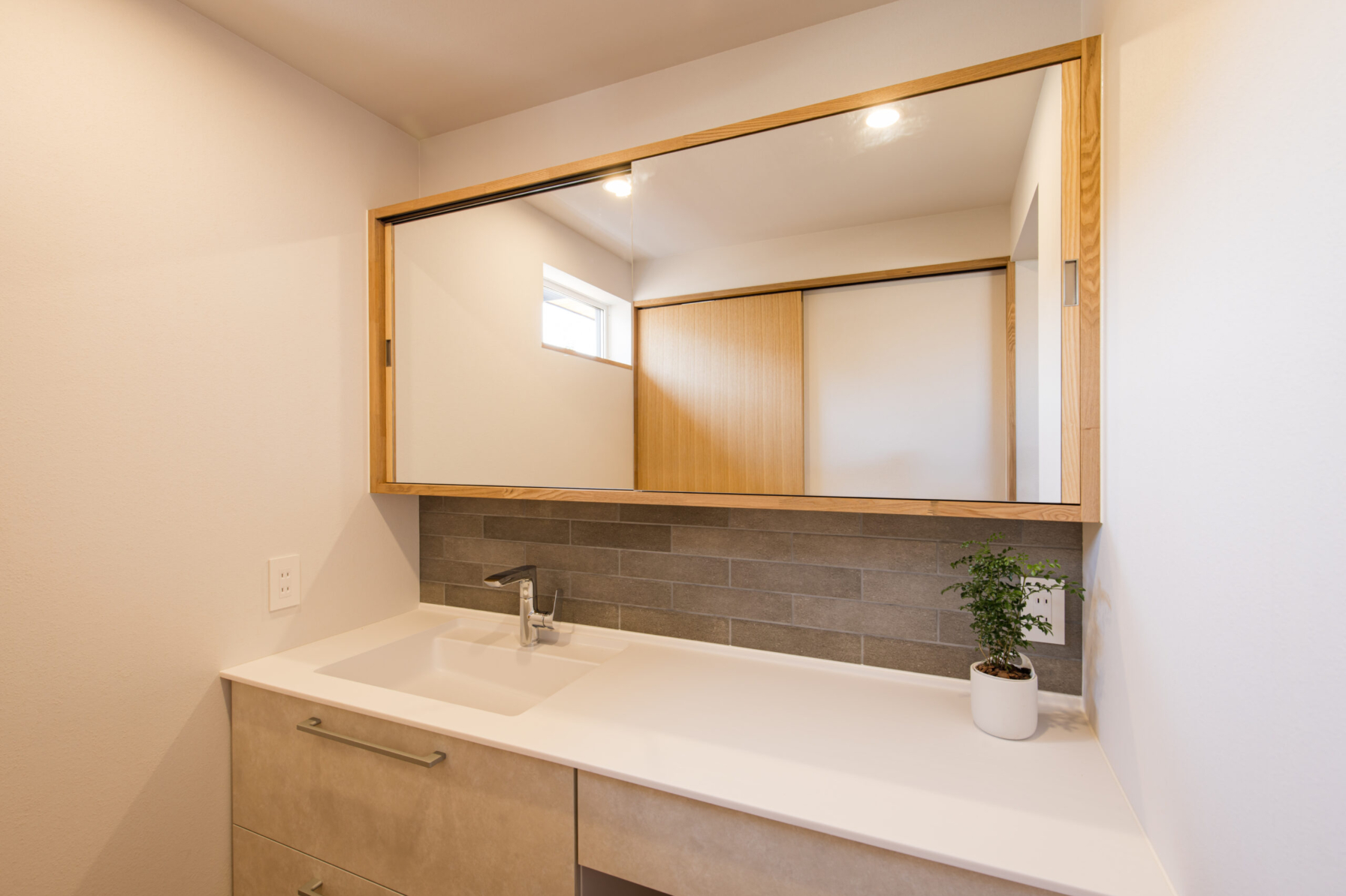 ゆとりのある洗面台で日々にもゆとりを。 造作の鏡は引き違いの鏡になっており、扉の中には収納できるスペースがあります。 たっぷりと収納できる洗面所を造作鏡との組み合わせで仕上げました。