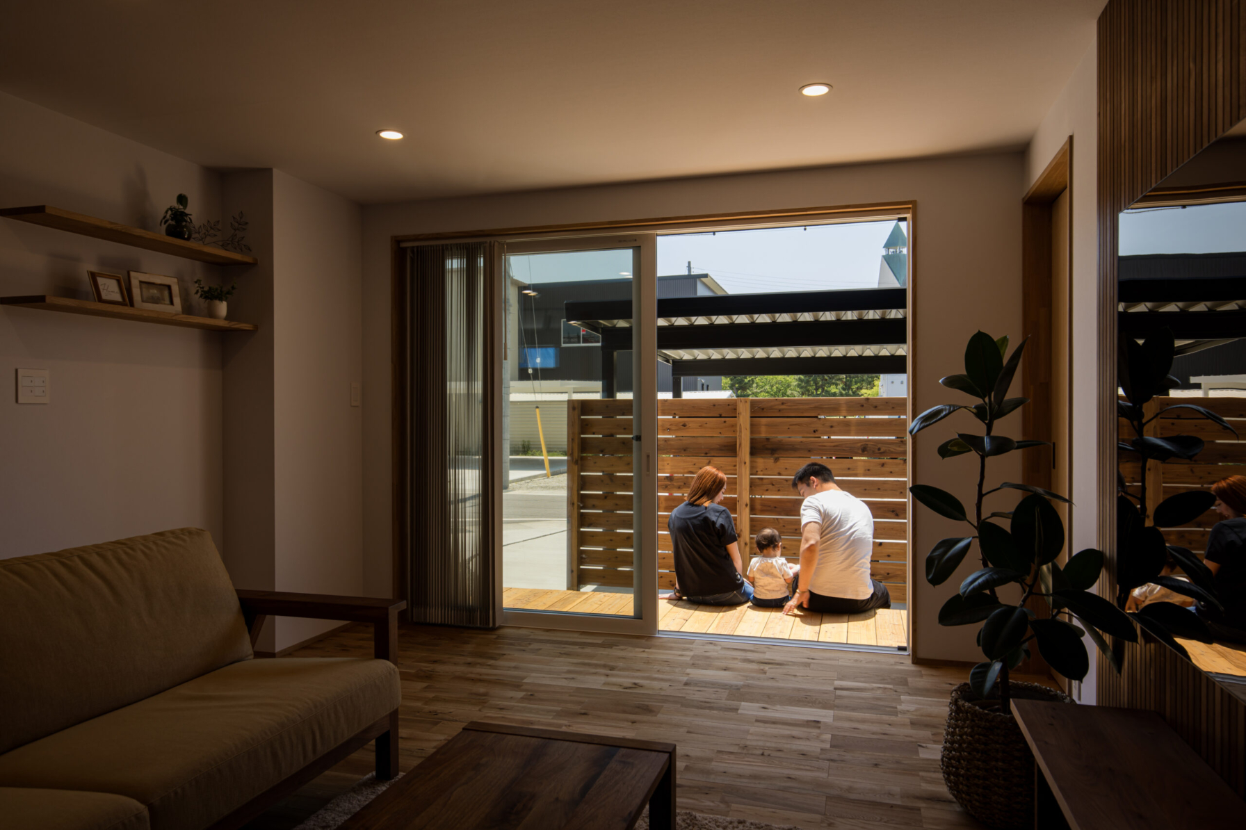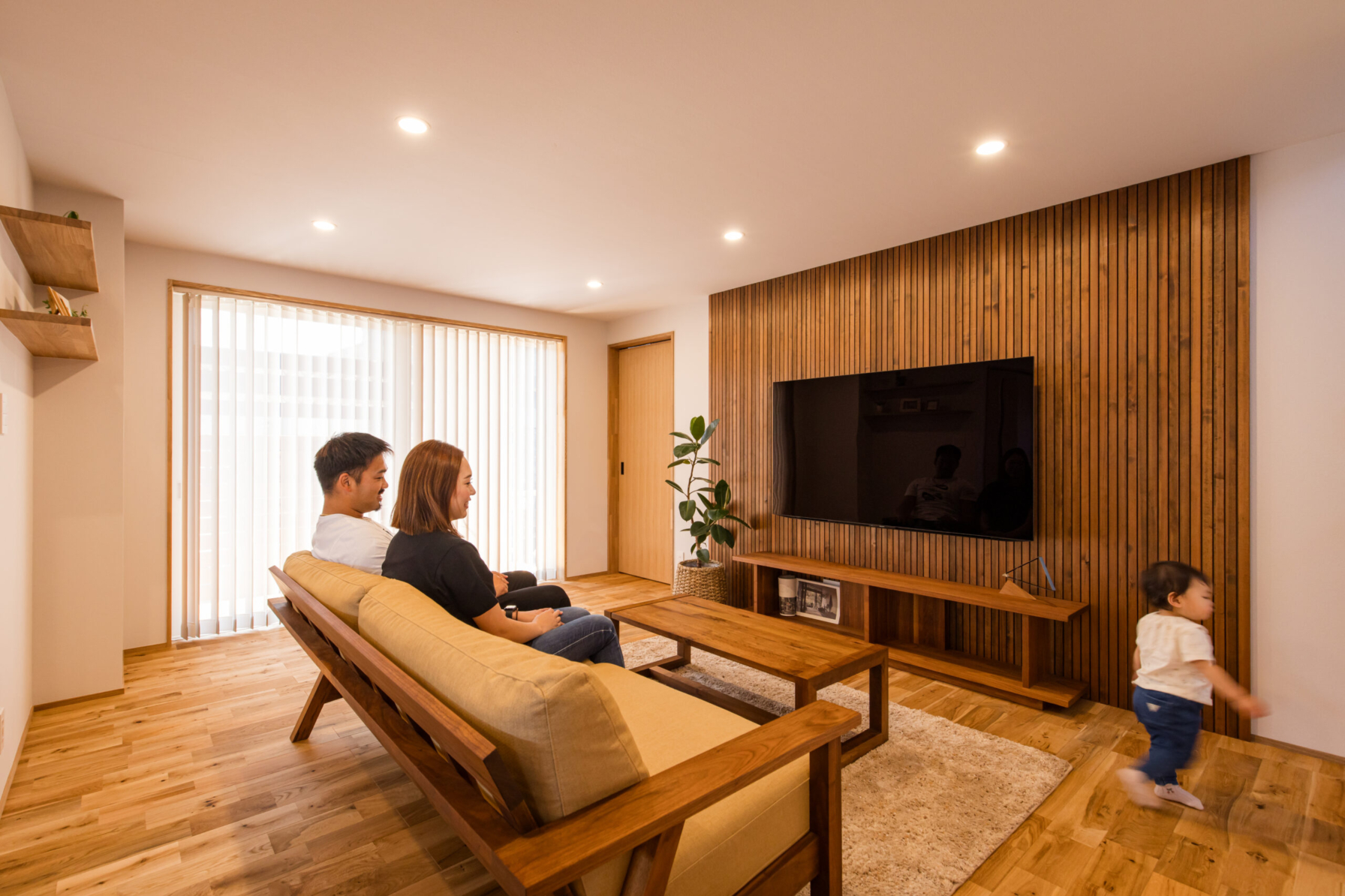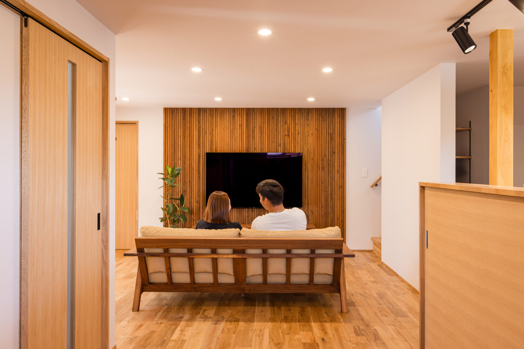 リビングでのくつろぎ大事にし、大きな窓からのたっぷりの光。 窓を開けるとウッドデッキになっており、内と外で繋がれる空間に。 テレビ面には旦那様こだわりのおしゃれな木の壁に。