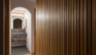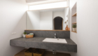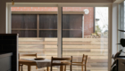 メインの空間の天井にはasoneがオリジナルで制作塗装した格子を施工しました。 このオリジナル格子は大工さんの丁寧な仕事で完成します。 材種などで工夫し、コストパフォーマンスが高く、意匠性も上げてくれます。 さらにここの天井の工夫は、格子と照明レールの高さを合わせる事でフラットなすっきりとした照明計画になっております。