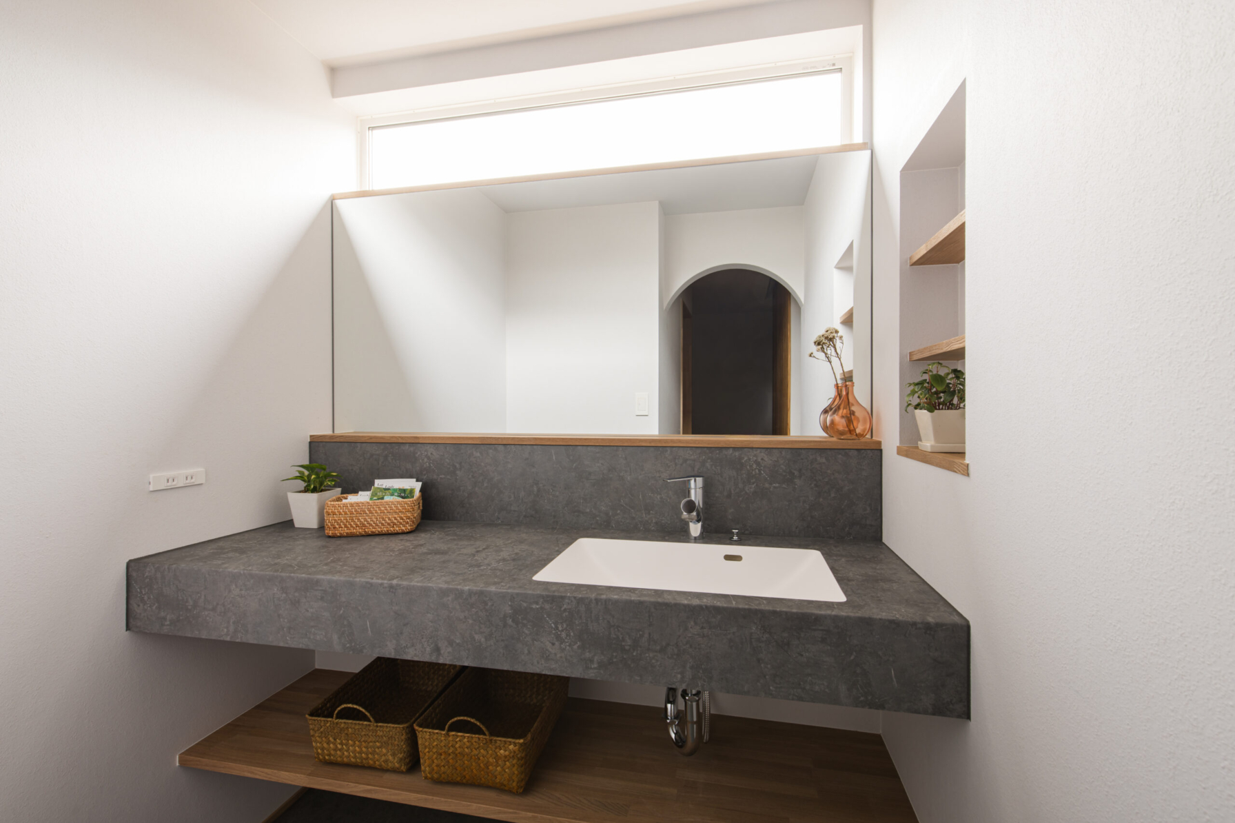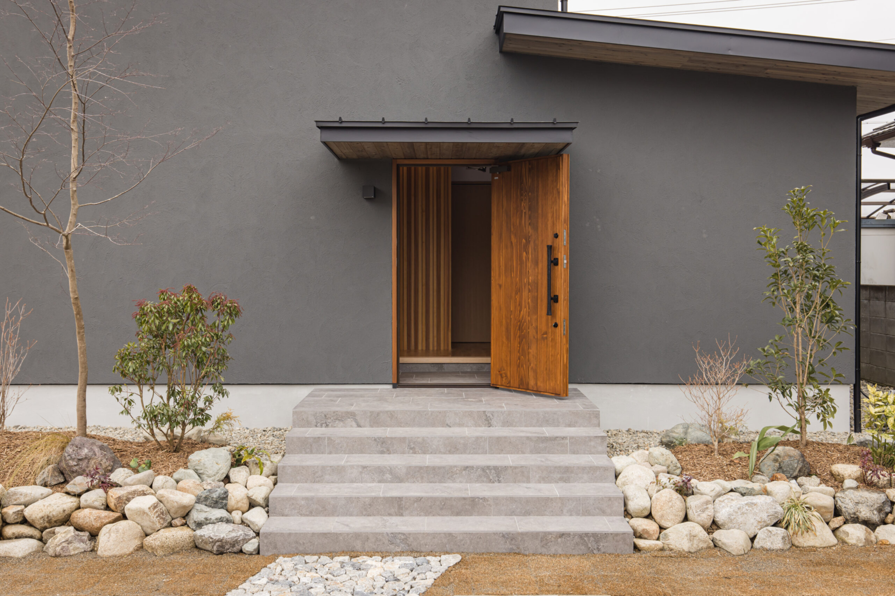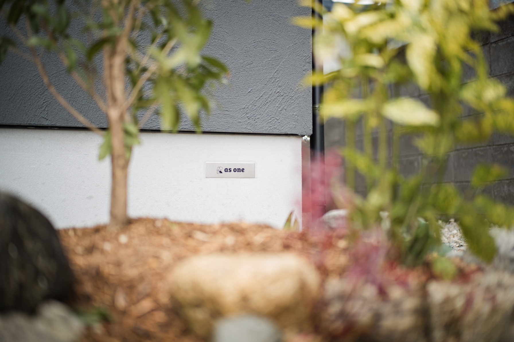 asoneの庭屋さんと共に、計画した外構です。 asoneは何か新しい物を使うというより、もともとある物を最大限活用することに重きをおいています。 そこの土地から掘削の際に出てきて石や、土。さらには、流木。という使い方をしています。 その中で四季を感じてもらう。四季で庭の見え方、家の見え方まで変えていきます。 建物と外構を合わせて計画していく事を大事に考えています。