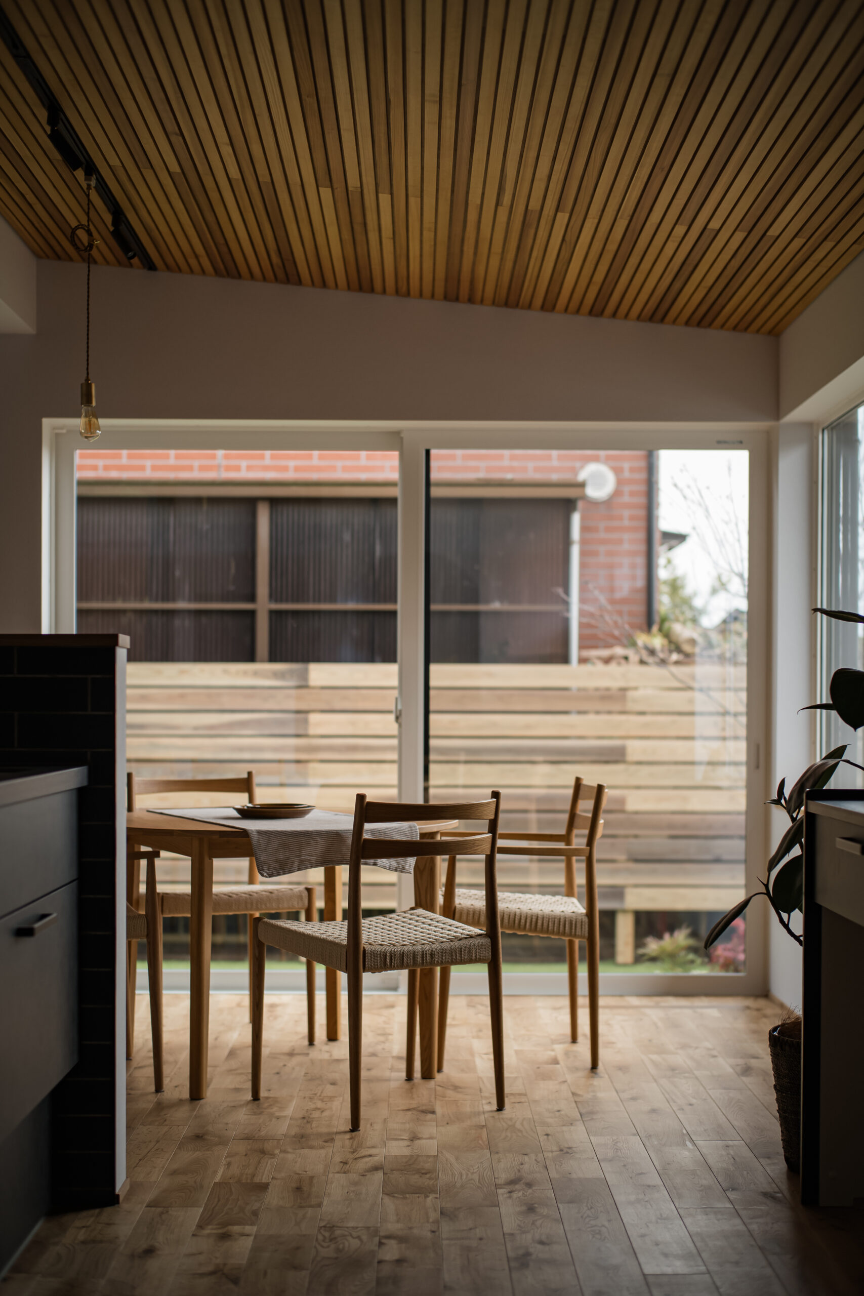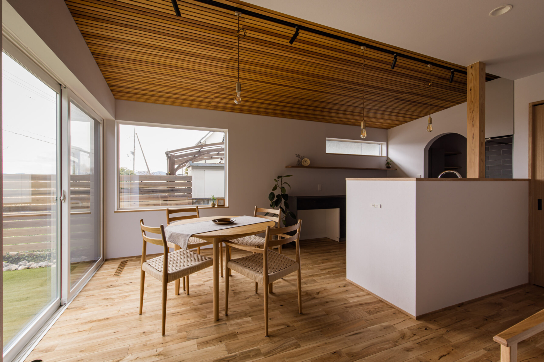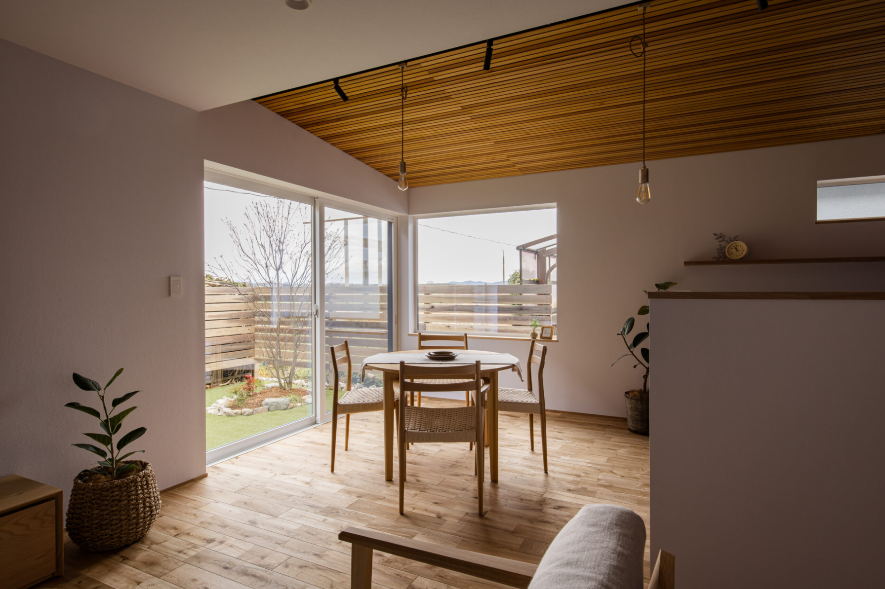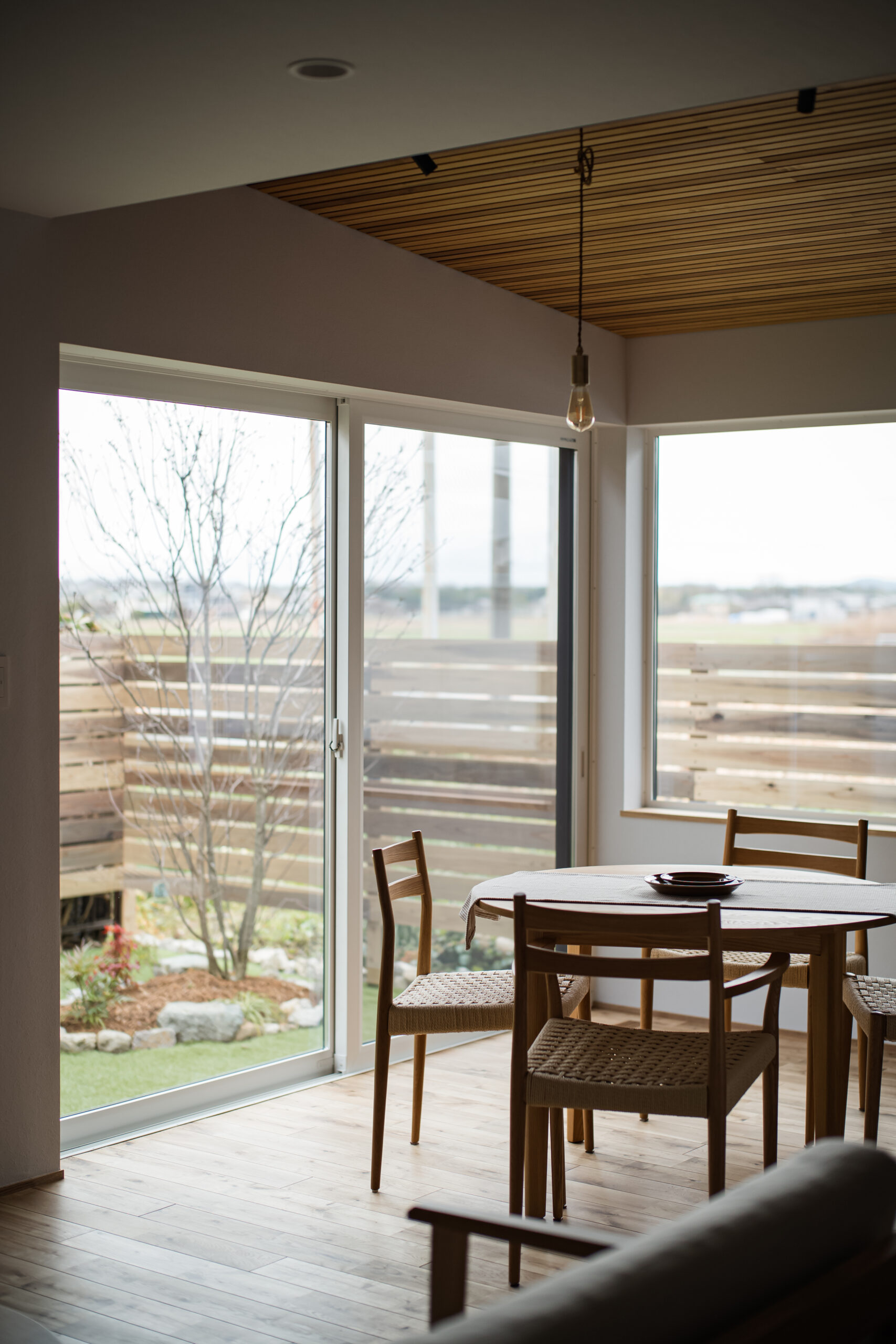 敷地環境を考慮し、LDKからの眺望を計画しました。 空気が澄んでいる時には遠くの山並みが綺麗に見えます。 また、裏庭のヤマボウシがあることで家の中から四季を楽しめます。 座った目線からはウッドフェンスがあることで車からの視線をカットしています。
