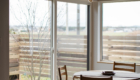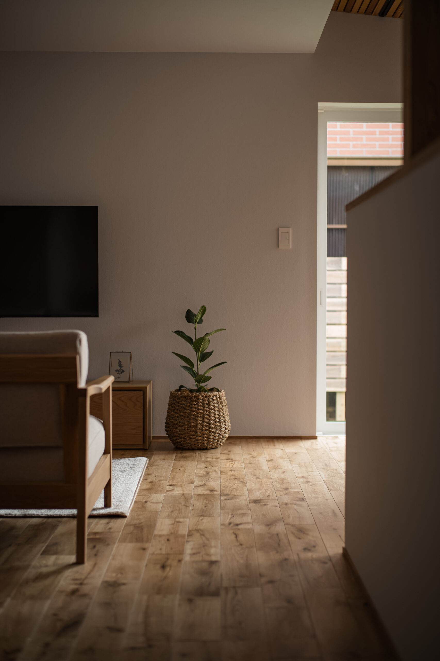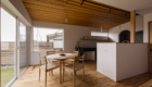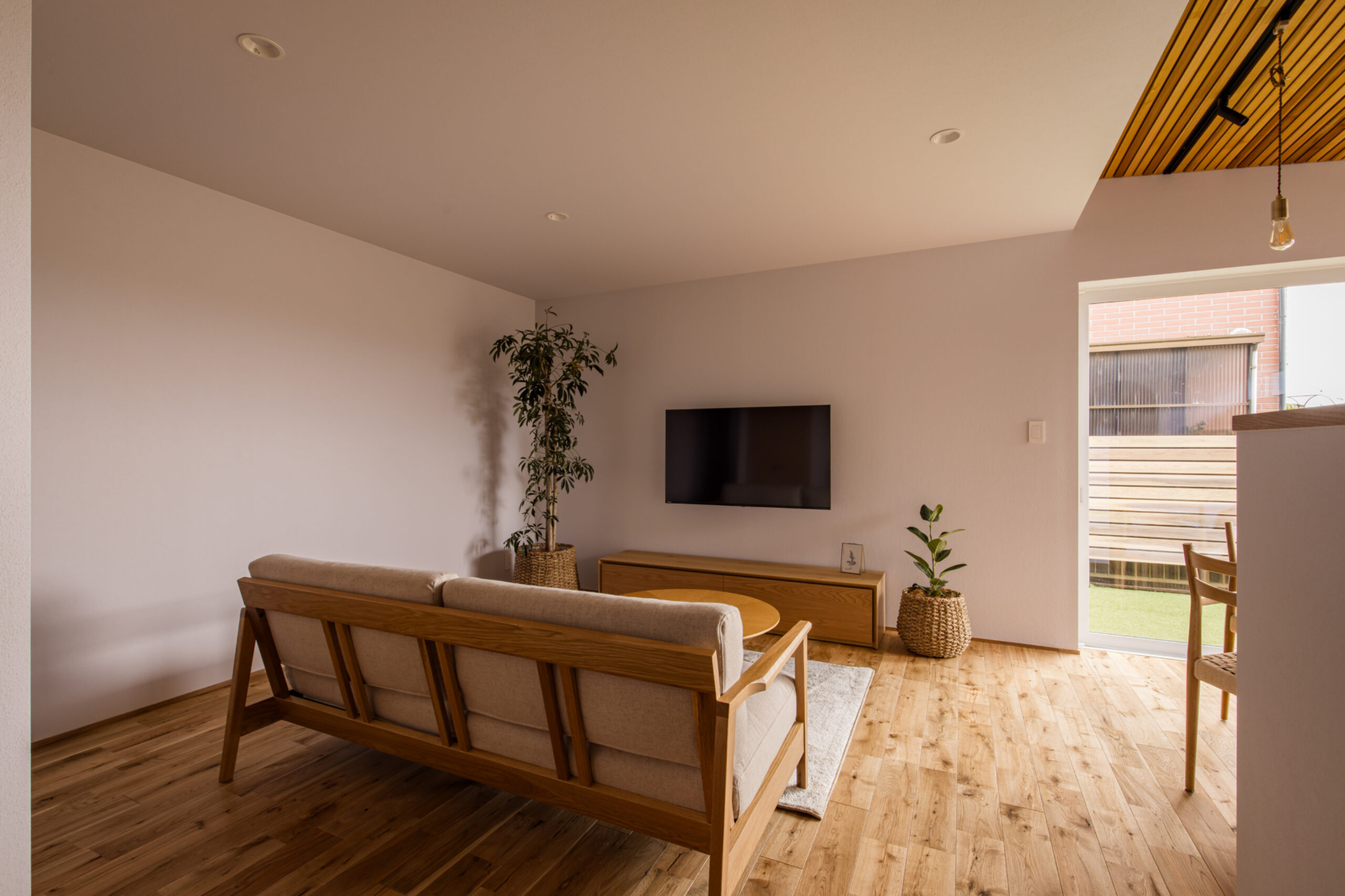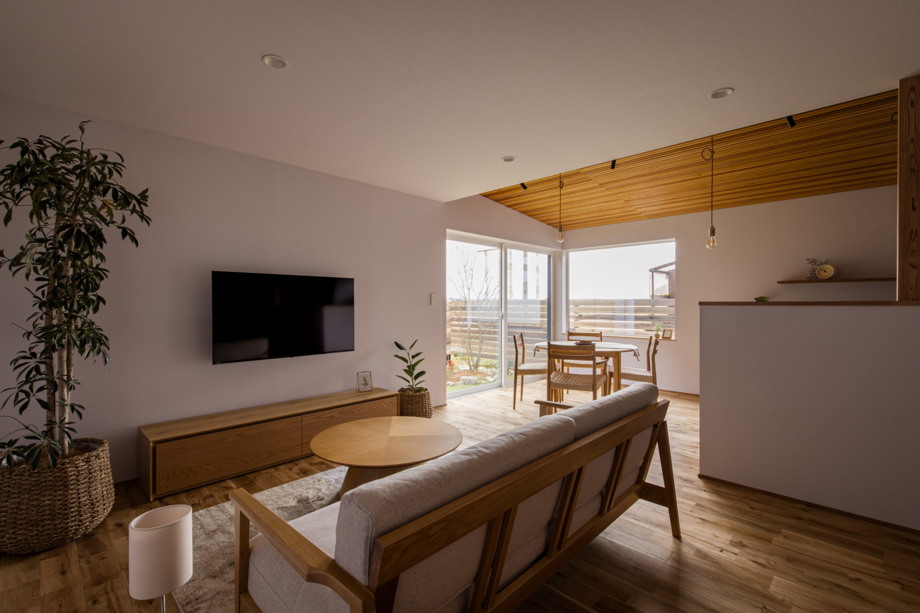 敷地環境を考慮し、LDKからの眺望を計画しました。 空気が澄んでいる時には遠くの山並みが綺麗に見えます。 また、裏庭のヤマボウシがあることで家の中から四季を楽しめます。 座った目線からはウッドフェンスがあることで車からの視線をカットしています。